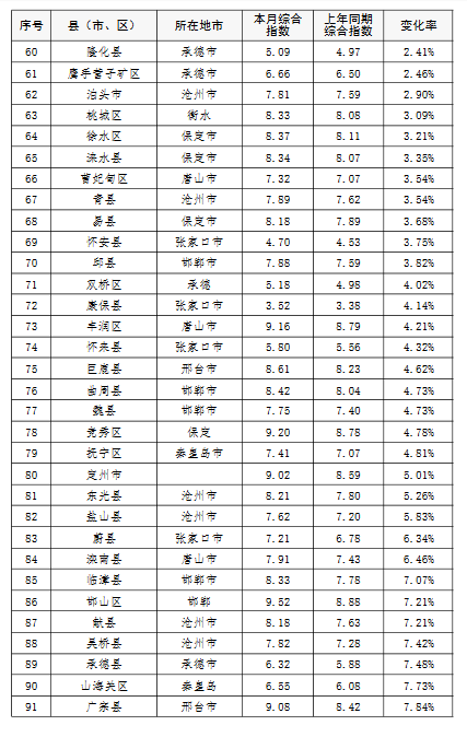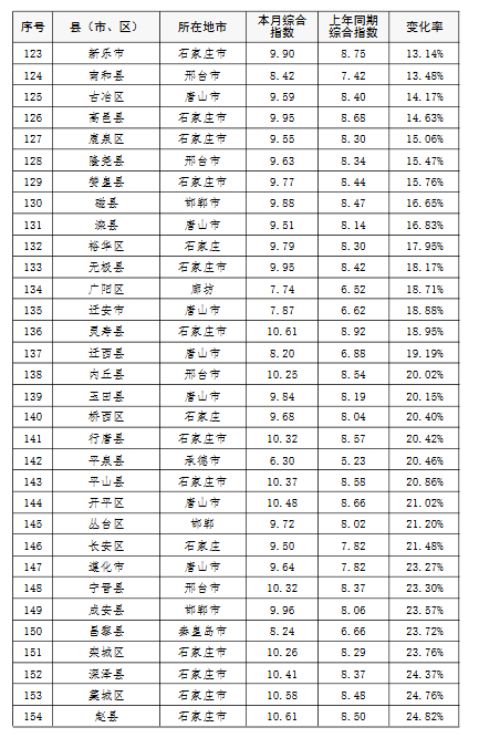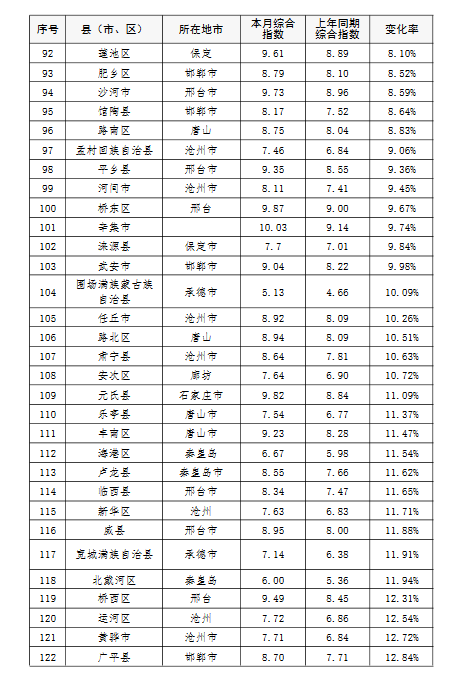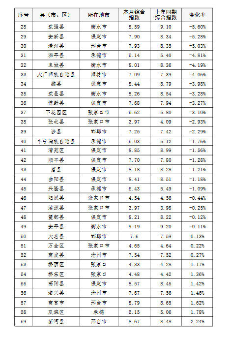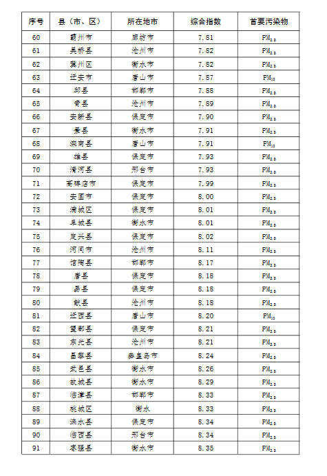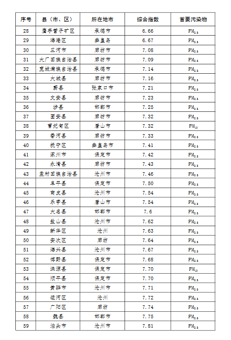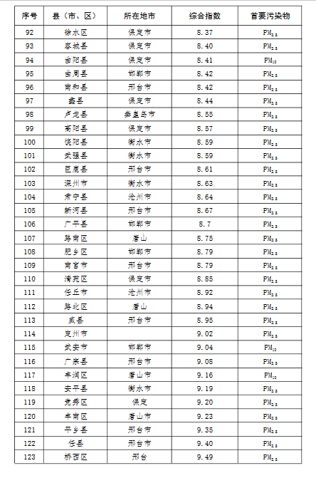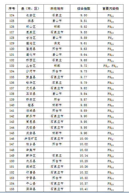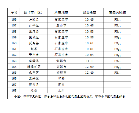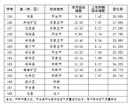 上半年,除去張家口和承德兩市所轄縣(市、區),全省空氣質量相對較差的10個縣(市、區),按污染由重到輕的順序排名,依次是:邯鄲市永年區、邯鄲市峰峰礦區、雞澤縣、晉州市、趙縣、靈壽縣、石家莊市藁城區、正定縣、唐山市開平區、井陘縣。