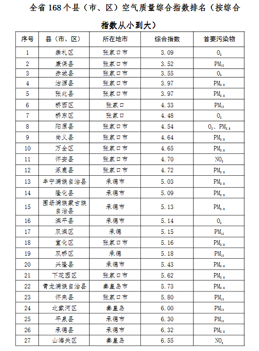 上半年,除去張家口和承德兩市所轄縣(市、區),全省空氣質量相對較好的前10個縣(市、區)依次是:青龍滿族自治縣、秦皇島市北戴河區、秦皇島市山海關區、秦皇島市海港區、三河市、大廣回族自治縣、大城縣,文安縣、涉縣、固安縣。