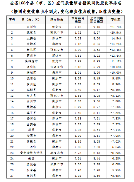 上半年,全省11個設區市城市空氣質量由好到差依次為:張家口、承德、秦皇島、滄州、廊坊、衡水、唐山、保定、邢臺、石家莊、邯鄲。